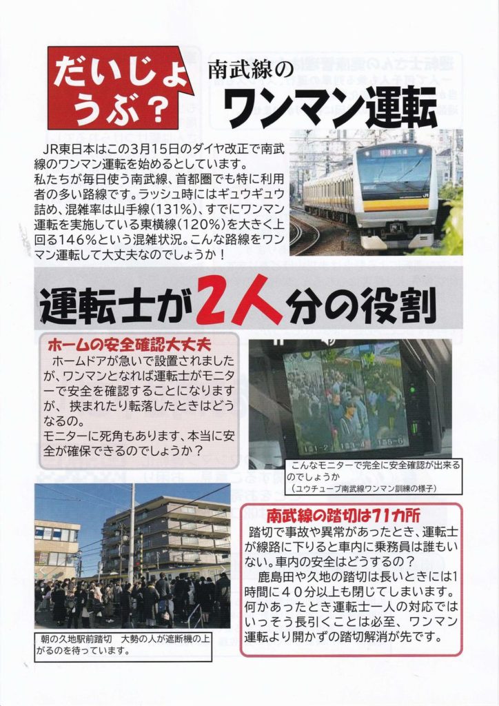 南武線のワンマン運転の中止を求める川崎市民連絡会(事務局:赤石090-5301-5091)