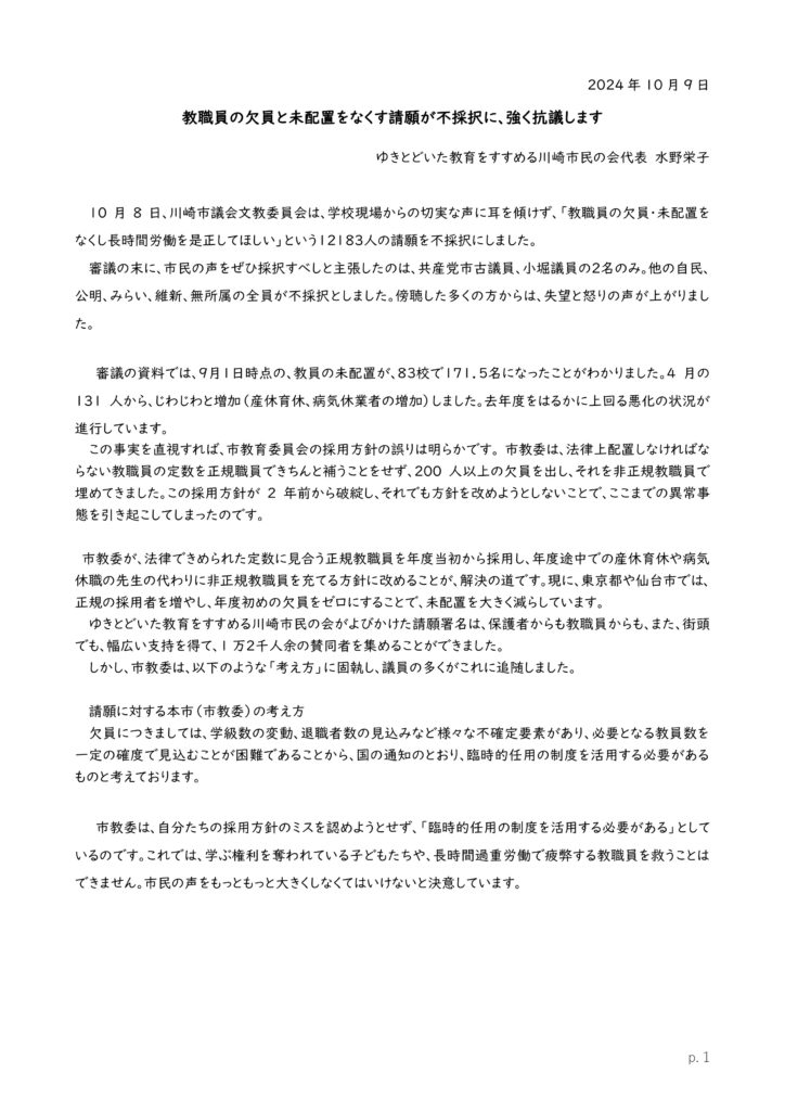 「教職員の欠員と未配置をなくす請願が不採択に抗議します」