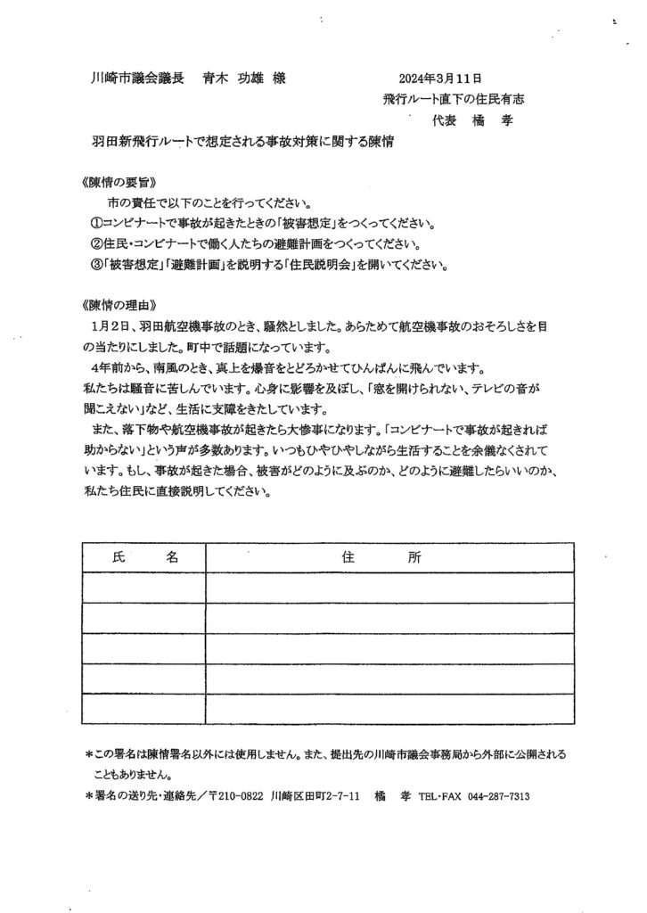 羽田新飛行ルートで想定される事故対策に関する陳情を提出