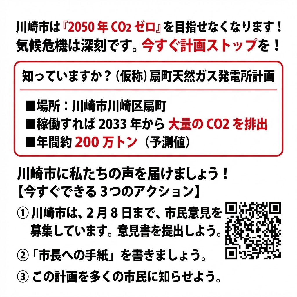 現在計画されている扇町天然ガス発電所の新設計画に反対します。 理由は、年間200万トンという膨大なCO2排出が、川崎市のカーボンゼロ目標を台無しにするからです。気候危機がこれだけ叫ばれている中、新しい火力発電所を作るべきではありません。川崎市は事業者を指導し、計画を白紙に戻させてください。火力ではなく、100%再生可能エネルギーを目指す施策に税金や資源を投入してください。