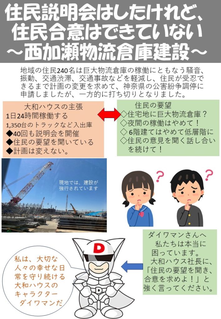 西加瀬の物流倉庫建設をめぐる事業者大和ハウスと地域住民の対立は、6年間も続いています。地域住民240名は、巨大物流倉庫の稼働にともなう騒音、振動、交通渋滞、交通事故などを軽減し、受忍できるまで計画の変更を求めて、神奈川県の公害紛争調停に申請をしました。