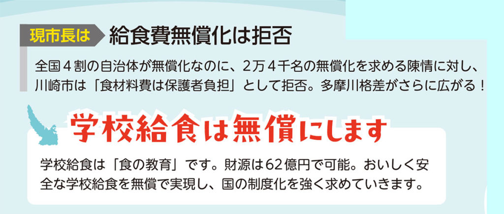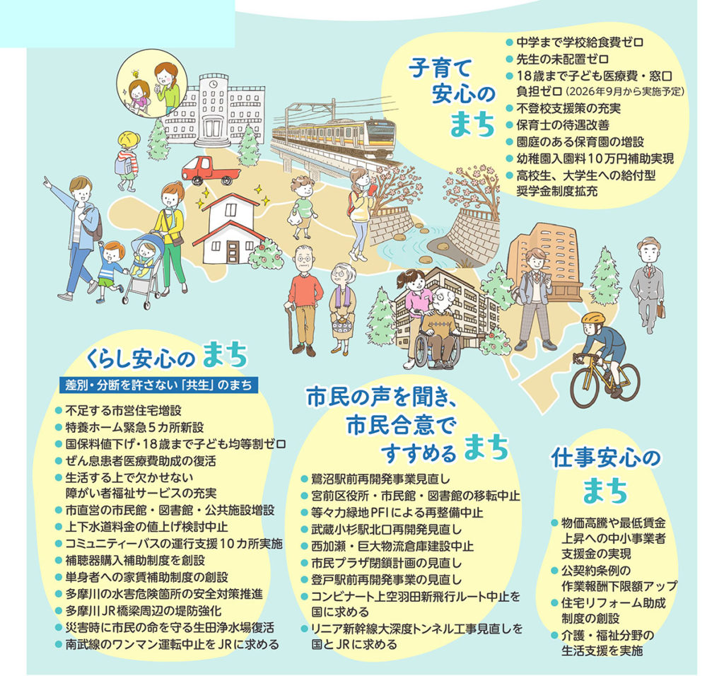 埼玉県のみさと協立病院で作業療法室を立ち上げました。そこには、社会の制度の狭間で困難な生活を送る患者さんがたくさんいらっしゃいました。 私は、そうした方々の人権を守り、無差別・平等の医療を届けることにやりがいを感じる一方で、医療制度そのものに課題があることを感じました。 【政治活動への転換、そして現在】 (写真: 政治活動の写真、子ども医療費助成の宣伝活動の写真) 結婚・出産を機に川崎市に移り住み24年。3人の子育てをしながら、長年「子ども医療費助成制度の拡充」をライフワークとして活動してきました。 医療従事者として、子どもの命と健康を守る子ども医療費助成制度の拡充は私の願いでした。 そしてつい最近20年以上の活動が実り、2026年からついに川崎も18歳まで子ども医療費無料とななりました。 私たち市民が声を上げ続けてきたことで、実現したのです。 東日本大震災で、子どものころ暮らしていた陸前高田市が変わり果てた姿になったことも、私にとって大きな転機でした。 南相馬市や陸前高田市での災害支援ボランティア、地元高津区内の放射能測定、脱原発運動にも取り組む中で、政治の役割を実感しました。 そして最近まで、横浜市にある保育所で働いていました。そこでは、仕事と子育てを必死に両立させようとする保護者の方々、そして賃金や配置基準など、多くの課題を抱えながらも奮闘する保育士の皆さんの姿を目の当たりにしました。保護者も、保育士も、誰もが安心して働き、笑顔で暮らせる社会が必要です。 私が政治を志した直接のきっかけは、家族に危機が訪れたことでした。 激務の夫を支えながら、ワンオペで子育てしつつ仕事との両立、さらに夫の両親の介護を、女性である私が一人で全ての責任を負うことになったのです。 このジェンダー不平等の社会を変えなければと心から思いました。 現在は、地域で子どもの登校見守り活動や保育施設の職員としての経験を活かし、誰もが安心して暮らせる社会を目指して活動しています。